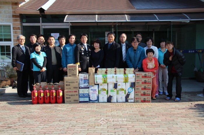 [시민일보]경북 구미소방서는 지난 23일 설 명절을 맞아 요양시설을 찾아 노인들에게 쌀, 라면, 화장지 등 생활필수품과 위문금을 전달하고 요양시설의 전반적인 상황에 대해 관계자들과 간담회를 했다. 사진은 성품 전달 후 기념촬영을 하고 있는 소방서 직원과 요양시설 관계자들의 모습.