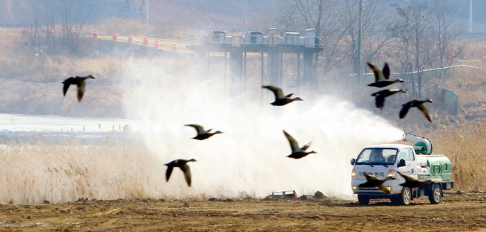 시화호의 야생조류 분변에서 AI 바이러스가 검출된 가운데 27일 오후 철새 도래지인 시화 갈대습지공원 인근에서 화성시 방역관계자들이 차량을 이용해 방역활동을 펼치자 철새들이 날아오르고 있다.