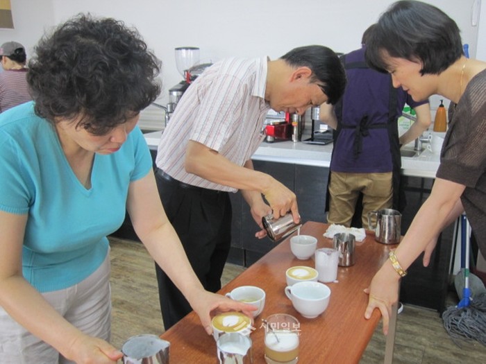 | ▲ [바리스타] 평생학습도시 일자리 창출 프로그램에 참여한 주민들이 바리스타 실습을 하고 있는 모습. | ||