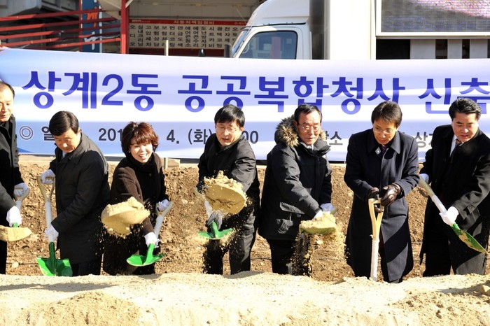 [시민일보] 4일 서울 노원구는 내년 3월 완공예정인 상계2동 공공복합청사 착공식을 가졌다. 공공복합청사는 지하 1층, 지상 5층 규모로 주민센터 기능과 도서관·보건소·예술창작소·동아리방 기능까지 결합된 복합공간으로 활용된다. 사진은 김성환 노원구청장과 내빈들이 함께 착공기념 시삽을 하고 있는 모습.