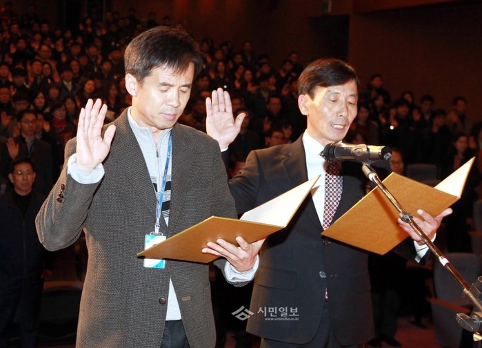 [시민일보]4일 경기 용인시가 시청에서 전직원이 참석한 가운데 청렴행정 실천 결의대회를 열고 공정한 직무수행, 신속·정확·친절한 민원처리로 신뢰받는 용인시청을 만들 것을 다짐했다. 사진은 2013 공직윤리 우수직원으로 선정된 직원 대표 2인이 청렴 결의문을 낭독하는 모습.