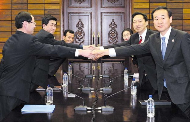 5일 경기도 파주시 판문점 북측 지역인 통일각에서 남북적십자 실무접촉 우리측 수석대표인 이덕행(오른쪽 두번째) 송혜진·김성근 대한적십자사 실행위원과 북측 대표단 박용일(왼쪽 두번째) 조선적십자회 중앙위원회 중앙위원을 비롯해 김영철·리강호씨가 이산가족상봉 행사 준비 논의에 앞서 악수를 하고 있다.