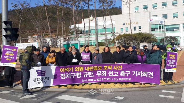 [시민일보]지난 4일 통합진보당 전남도당 당직자 및 당원들이 광주지방검찰청 목포지청 앞에서 이석기 의원 내란음모 혐의에 대한 검찰 구형에 반발해 검찰의 정치구형을 강력히 규탄한다는 내용의 기자회견을 열었다. 사진은 검찰 구형에 반발하는 통진당 지지자들의 모습.