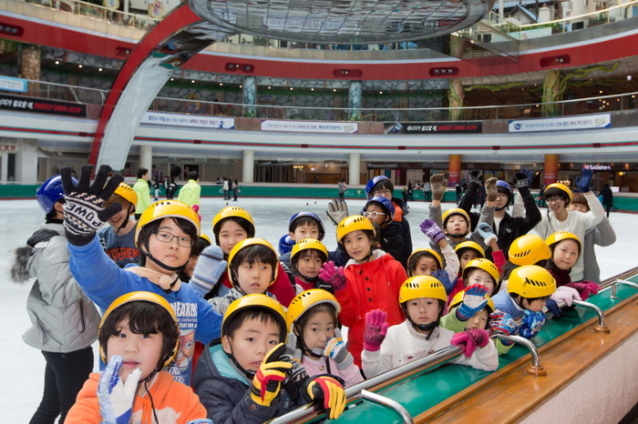 지난 5일 서울 송파구 잠실 롯데월드 아이스링크(대표 이동우)에서 열린 롯데월드 어드벤처 ‘저소득층 아이들 아이스링크 체험행사’에서 아이들이 피겨 스케이팅을 직접 배우며 즐거운 시간을 보내고 있다.