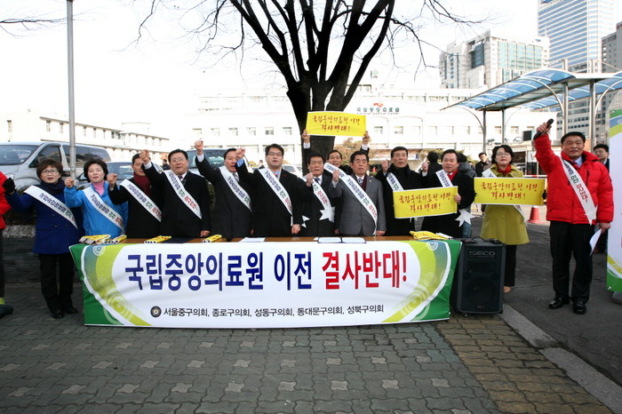 | ▲ 7일 국립중앙의료원 정문에서 서울 중구·종로구·성동구·동대문구·성북구 의장 및 의원들이 공동성명서 발표 후 국립중앙의료원이전을 반대하며 구호를 외치고 있는 모습. | ||