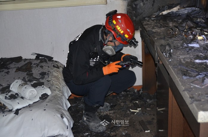 [시민일보]지난 9일 서울 강남구 대치동에 위치한 호텔 객실 902호 화장대 부근에서 원인미상의 화재가 발생했다. 인명피해없이 약 450만원 상당의 재산피해를 입히고, 밀폐된 공간에서 연소 중 실내 산소부족으로 자체 소진됐다. 사진은 화재현장을 방문한 강남소방서 대원의 모습.