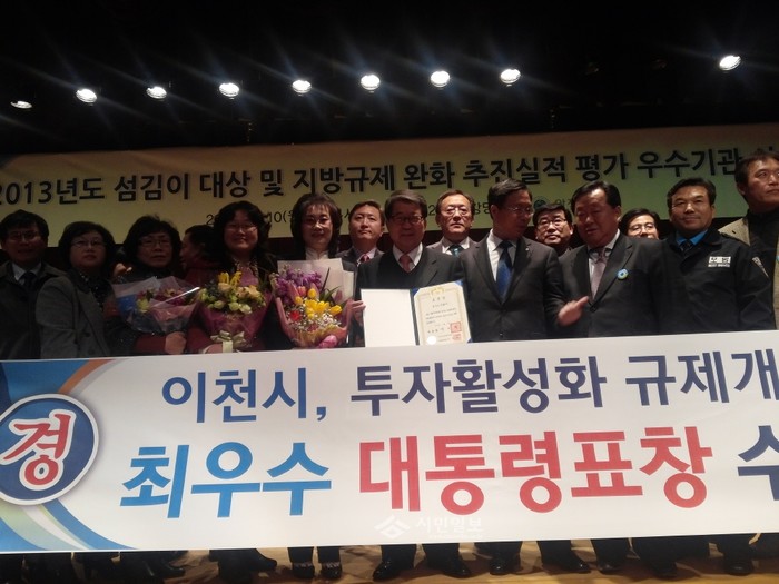 [시민일보]경기 이천시가 10일 오후 서울정부종합청사 대강당에서 열린 '투자활성화를 위한 지방규제개선 우수기관' 시상식에서 최우수기관 대통령표창을 받았다. 조병돈 이천시장(앞줄 가운데)이 대통령표창을 받은 뒤 시청 관계자들과 함께 기념촬영을 하고 있는 모습.