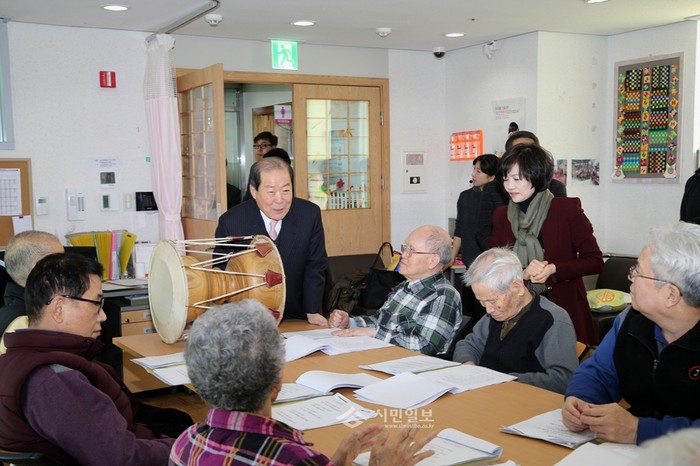 [시민일보]서울 마포구는 오는 14일까지 참여 구정 구현을 위한 기틀 마련을 위한 ‘동 주민대표와의 간담회’를 개최해 16개동 주민센터를 순회하며 주민과 소통하고 구의 비전을 공유했다. 사진은 지난 4일 아현실버문화센터를 방문해 문화강좌를 수강중인 노인과 대화하는 박홍섭 마포구청장의 모습.