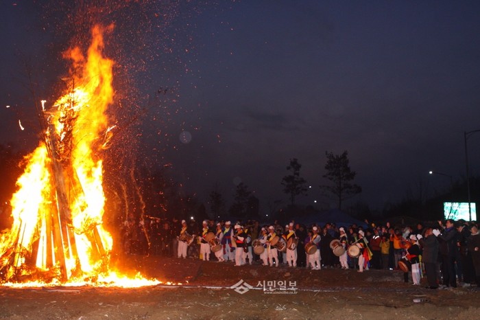 | ▲ 지난해 열린 정월대보름에 진행된 '달집태우기 행사'에서 타오르는 달집과 이를 보는 주민들의 모습. | ||
