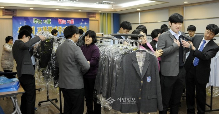 [시민일보]지난 10일 서울 광진구가 신학기를 맞아 학부모들의 경제적 부담을 덜고 자원 재활용을 촉진하기 위해 대원고등학교에서 '2014 사랑의 교복 물려주기' 행사를 열어 1000여점의 교복을 한 점당 1000원에 판매했다. 사진은 이날 자신에게 맞는 교복을 고르는 학부모와 학생들의 모습.