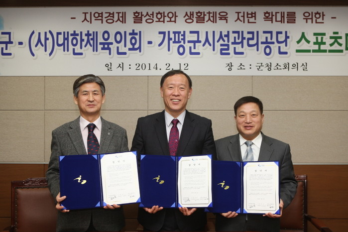 [시민일보] 12일 경기 가평군이 (사)대한체육인협회, 가평시설관리공단과 스포츠마케팅으로 지역경제를 활성화하고 생활체육의 저변을 확대하기 위해 상호협력하는 내용의 공동협약을 맺고 각종 스포츠 대회 유치·개최에 함께 노력하기로 했다. 사진은 이날 협약식에 참여한 남상남 대한체육인회 공동대표, 김성기 양평군수, 최성진 시설관리공단 이사장의 모습.