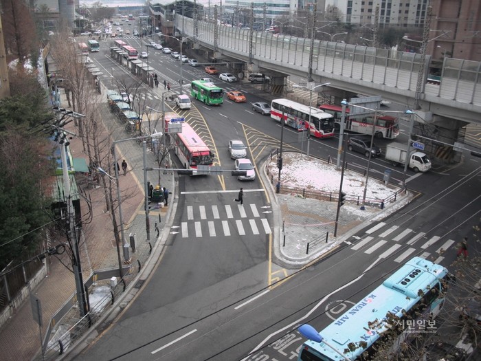 | ▲ 광진구는 지하철 강변역 인근의 구남초등학교 근처 삼거리를 보행자 우선구역으로 정하고 횡단보도 직선화, 보행자용 방호울타리 등을 설치했다. | ||