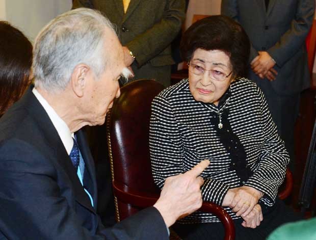 무라야마 도미이치 전 일본 총리가 13일 오전 서울 마포구 김대중도서관에서 이희호 김대중평화센터 이사장과 대화를 나누고 있다.