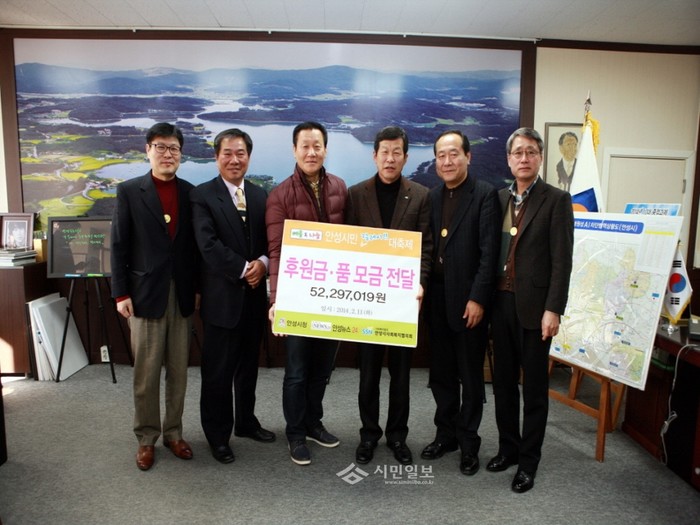 [시민일보]경기 안성시는 지난 11일 안성시사회복지협의회와 안성뉴스24에서 지난해 ‘2013 베품&나눔 안성시민 릴레이 대축제’를 통해 모은 성금 전액을 전달받았다. 사진은 관계자들이 기념촬영을 하는 모습.