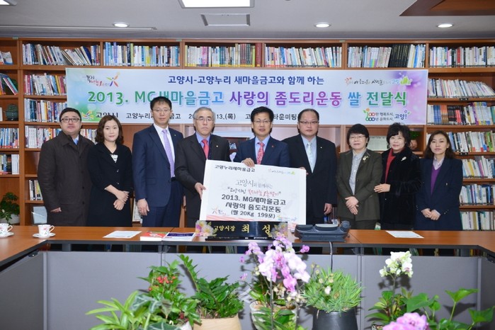 [시민일보]고양누리 새마을금고는 지난 13일 ‘사랑의 좀도리 운동’을 통해 모은 성금으로 구입할 쌀 20㎏ 199포를 경기 고양시에 기탁했다. 사진은 최성 고양시장(왼쪽 다섯번째)과 김상철 고양누리새마을금고 이사장(왼쪽 네번째) 등 관계자들이 기념촬영을 하는 모습.