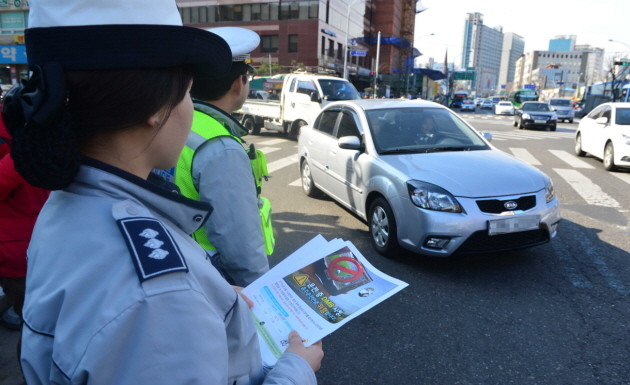 14일 오전 서울 동대문구 한 삼거리에서 경찰이 운전 중 DMB 시청을 단속하고 있다. 법제처는 도로교통법 개정으로 14일부터 운전 중 DMB를 시청하다 적발되면 승용차 6만원, 승합차 7만원의 범칙금이 부과된다고 밝혔다. 이는 지난 2012년 5월 경북 의성에서 DMB를 시청하던 화물차 운전자가 사이클 선수단을 덮쳐 3명이 사망한 사고 이후 나온 후속대책이다. 경찰은 오는 4월까지 홍보 차원에서 계도 위주의 단속을 할 예정이라고 밝혔다.