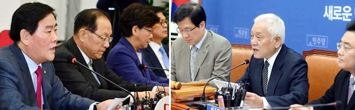 17일 오전 서울 여의도 국회 새누리당 대표실에서 열린 최고위원회의에서 최경환 원내대표가 서울시 공무원 간첩사건관련 이야기하고 있다(좌). 17일 오전 민주당 최고위원회의가 열린 서울 여의도 국회 당 대표실에서 김한길 대표가 서울시 공무원 간척사건등 모두발언을 하고 있다.