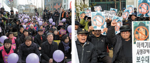 (좌)통합진보당 이석기 의원과 구속자들의 내란음모 사건 1심 선고일인 17일 오후 경기도 수원 영통구 수원지방법원 앞에서 통합진보당이 집회를 열고 구속자들의 무죄석방을 촉구하고 있다. (우)17일 오후 경기도 수원시 영통구 수원지방법원 앞에서 대한민국 고엽제 전우회, 대한민국 특전사 전우회, 중앙청년회 등 보수단체 회원들이 이석기 의원에 대한 엄벌을 촉구하며 기자회견을 하고 있다.