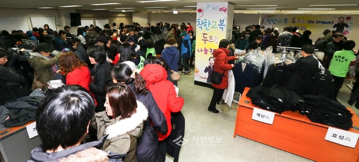 [시민일보]지난 17일 인천 계양구는 지역내 저소득층들에 일자리를 제공하고 학부모들의 교복구입비 부담을 줄이기 위해 기증받은 교복을 자활센터 의류리폼사업단에서 손질해 신입생들에게 저렴하게 판매하는 '착한교복 두드림' 행사를 열었다. 사진은 이날 행사에 참여한 주민들이 교복을 고르는 모습.