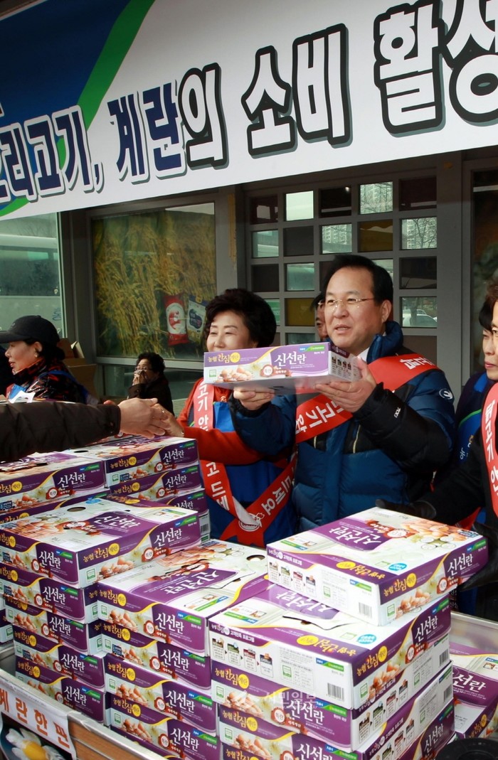 [시민일보]경기 용인시에서는 최근 AI 발생 이후 닭고기 소비 부진으로 인한 양계농가의 경영난을 해소하고 닭고기의 안전성을 홍보하기 위해 18일 행정타운 청소년 수련관 앞에서 직거래 및 사전구매 행사가 열렸다. 사진은 김학규 용인시장이 시민에게 달걀을 건네는 모습.