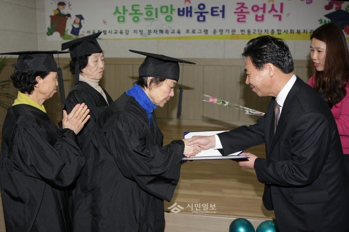 [시민일보]지난 17일 서울 강북 삼동희망배움터는 2013년 초등학교 인정 문자해득교육 프로그램 삼동희망배움터 첫 번째 졸업식에서 초등학교 과정 졸업생과 4명의 중학과정 진학생 등 19명의 졸업생에게 졸업장과 상장을 수여했다. 사진은 박문수 의원이 졸업생에게 상장을 수여하고 있는 모습.