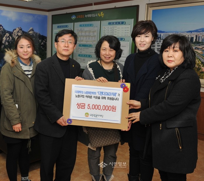 [시민일보]서울 노원구 (사)함께가는노원장애인부모회는 지난 17일 도봉운전면허시험장에 설치된 발달장애인카페 디엔디에서 발달장애인들이 1년 동안 벌어들인 수익금 500만원을 노원교육복지재단에 전달했다. 사진은 김성환 노원구청장이 수익금을 전달받고 있는 모습.