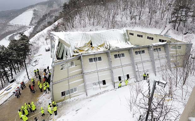 18일 오전 경북 경주시 양남면 마우나리조트 체육관의 지붕이 힘없이 내려 앉아 있다. 경찰을 비롯한 현장 관계자들이 사고 현장을 둘러보고 있는 모습.