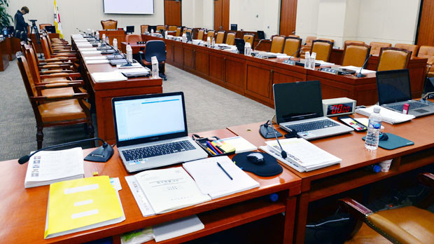 18일 오후 서울 여의도 국회 기획재정위원회 회의실에서 한국은행 등 업무보고가 예정된 가운데 회의가 파행을 빚어 빈 자리들이 보이고 있다. 이날 업무보고는 국회 기재위 소속 야당 의원들이 과거 안홍철 한국투자공사 사장의 트위터 발언을 문제삼아 예정된 개회 1시간여 만에 중단되어 파행을 빚었다.