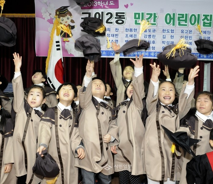 [시민일보]서울 광진구 구의2동 주민센터에서 19일 '어린이집 원생 합동 졸업식'을 열었다. 이날 행사에는 초등학교 입학을 앞둔 지역내 대일·신예지·예랑·평화 등 4개 민간어린이집 졸업생과 학부모·교사 등이 참석해 어린이들의 졸업을 축하했다. 사진은 학사모를 던지고 있는 졸업생의 모습.