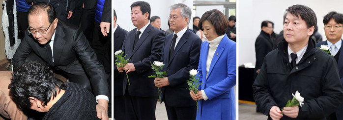 (좌)경주 마우나 오션리조트 체육관 붕괴 사고로 목숨을 잃은 학생들의 빈소가 마련된 울산 북구 21세기좋은병원 장례식장에서 18일 새누리당 황우여 대표가 유가족을 위로하고 있다. (중)민주당 문재인 의원과 민주당 관계자들은 부산시 금정구 남산동 캠퍼스 만오기념관을 찾아 조문을 하고 있다. (우)안철수 의원도 부산외국어대학교 9명의 합동분향소가 남산동 캠퍼스에 마련된 가운데 18일 오후 안철수 의원이 분향소를 찾아 헌화를 하고 있다.