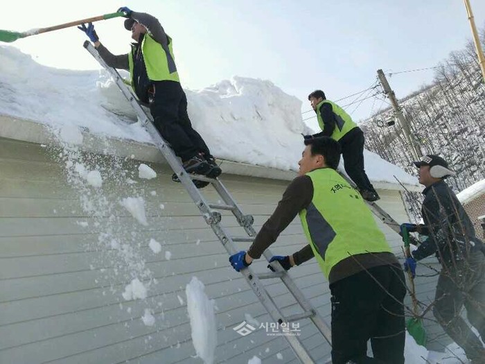 [시민일보]지난 19일 서울 마포구는 강원도 삼척시 미로면 적석리에 직원 일부를 파견해 삼척시 지역자율방재단과 함께 제설장비 투입이 어려운 지역의 이면도로와 지붕 위에 쌓인 눈을 치우고 폭설 피해복구를 위한 봉사활동을 펼쳤다. 사진은 지붕 제설작업을 하는 모습.
