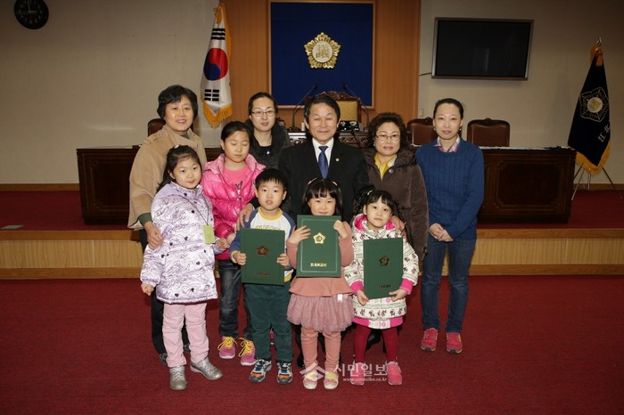 [시민일보]서울 강북구의회는 지난 19일 오후 3시 3층 본회의장에서 전국아동미술대회에 참가하여 우수한 성적으로 수상한 무지개유아스쿨어린이집 원생들에대해 상장을 수여했다. 사진은 상장 수여식 후 기념촬영 하는 모습.