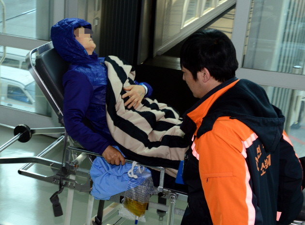 이집트 성지순례 도중 폭탄테러를 당해 부상당한 충북 진천 중앙장로교회 신도가 20일 오후 인천국제공항을 통해 입국해 들것에 실려 구급차로 이동하고 있다.
