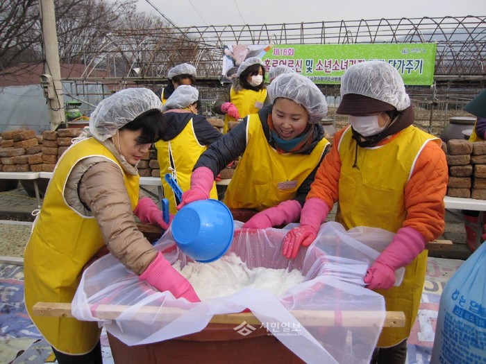 [시민일보]지난 20일 서초구 직원부인자원봉사회는 16년째 맞이한 된장과 간장을 직접 담가 생활이 어려운 이웃들에게 전달하는 '사랑의 된장, 간장 담가주기 행사'를 대원농장에서 개최했다. 사진은 행사에 참가한 봉사자들이 된장과 간장을 만들기 위해 소금물을 만드는 모습.