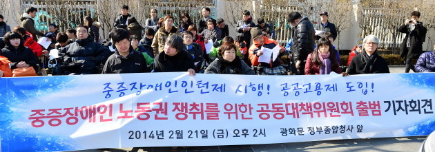 21일 오후 서울 종로구 정부서울청사 앞에서 중증장애인 노동권쟁취를위한공동대책위원회 회원들이 '중증장애인 노동권 쟁취를 위한 공동대책위원회 출범 기자회견'을 하고 있다.