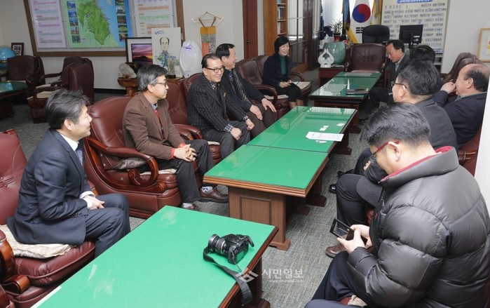 [시민일보]서울 성북구가 자매결연을 맺은 강원 삼척시에 제설장비 및 인력을 파견해 제설작업을 도운 데 이어 지난 21일 지역내 직능단체들이 삼척시를 방문해 폭설피해 구호지원금으로 500만원을 전달했다. 사진은 성금을 전달한 후 대화 중인 단체 관계자들의 모습.