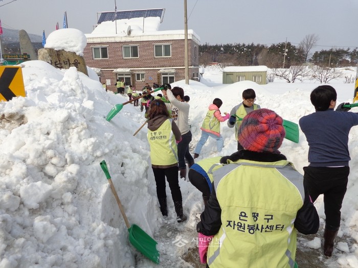 [시민일보]지난 20일 서울 은평구 자원봉사센터는 직원·자원봉사자 40여명과 함께 강원도 강릉시 일대를 방문해 제설작업을 지원하는 한편 고립된 주민들을 위해 길을 만드는 봉사활동을 실시했다. 사진은 제설작업 중인 봉사자들의 모습.