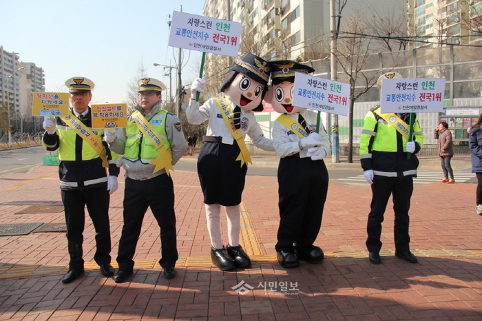 [시민일보]25일 인천계양경찰서가 인천 계양구 작전동에서 교통사고 사상자를 줄이고 선진교통문화를 정착시키고 교통무질서 관행을 개선하기 위해 어깨띠, 피켓 등을 활용한 거리캠페인을 실시했다. 사진은 이날 캠페인에 참여한 경찰 마스코트 포돌이·포순이와 경찰관들의 모습.