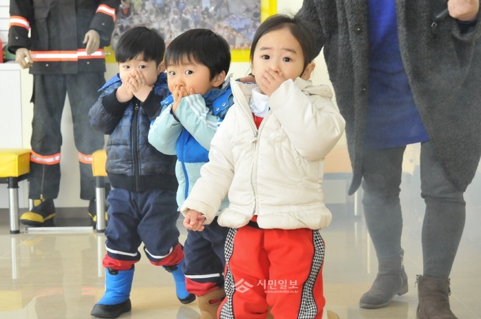 [시민일보]25일 서울 은평소방서가 시민안전체험교실에서 지역내 어린이집 원아들과 지도교사를 대상으로 인형극을 통한 안전사고 대처요령을 교육하고 가상 재난현장 대피훈련을 실시했다. 사진은 이날 가상 대피훈련을 통해 화재시 대처요령을 배우는 어린이들의 모습.