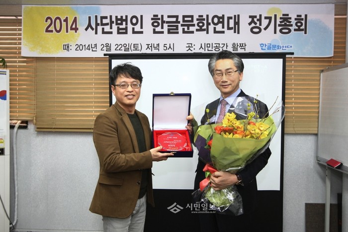 [시민일보]최근 한글문화연대가 국적불명의 이름이나 뜻을 알수 없는 외국어 간판을 한글로 바꾸는 일에 적극 앞장서 온 김영종 서울 종로구청장 외 2인을 '2013 우리말사랑꾼'으로 선정하고 기림패를 전달했다. 사진은 기림패 수여식에 참여한 이건범 한글문화연대 대표(왼쪽)와 김영종 종로구청장(오른쪽)의 모습.