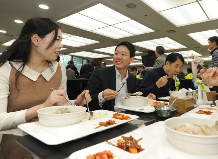 [시민일보]서울 중구는 26일 최근 조류인플루엔자 확산으로 줄어든 닭고기 소비를 촉진하고 닭고기의 안전성을 홍보하기 위해 구청 구내식당 담소락홀에서 점심식사 메뉴로 삼계탕을 제공했다. 사진은 점심 메뉴로 나온 삼계탕을 먹고 있는 구청 직원들의 모습.