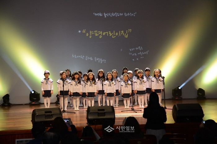 [시민일보]지난 25일 경기 양평군이 출산장려 분위기를 조성하고 아이를 키우는 부모들의 스트레스 해소를 돕기 위해 지역 주민 500여명이 참여한 ‘양평 맘과 함께하는 토크콘서트 희노愛락’을 열고 가족행복의 가치를 되새겼다. 사진은 이날 무대에서 공연한 양평어린이집 원아들의 모습.