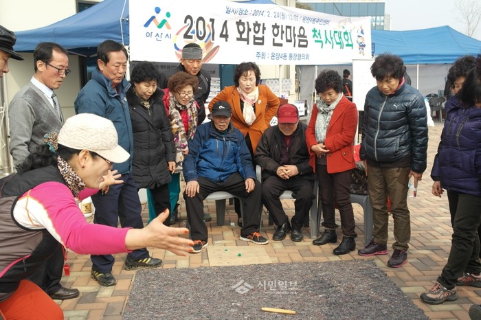 [시민일보]지난 24일 충남 아산시 온양4동 통장협의회가 주민센터 광장에서 지역주민의 안녕을 기원하고 지역내 기관ㆍ단체들의 단결을 다지기 위해 주민 100여명이 참여한 가운데 ‘2014 온양4동 화합 한마음 척사대회’를 열었다. 사진은 이날 참여자들이 윷을 던지고 있는 모습.