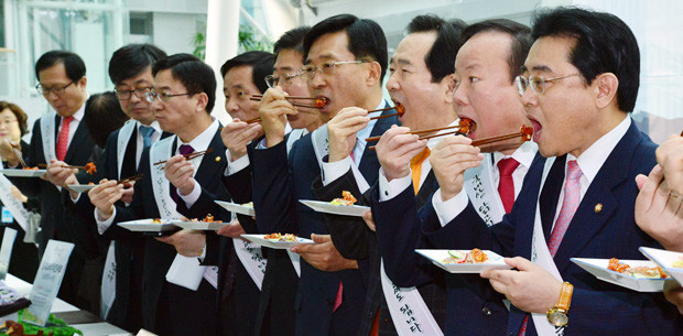 민주당 AI 대책특위는 27일 오전 서울 여의도 국회 의원회관 3층 로비에서 전병헌 원내대표, 최규성 의원, 김춘진 의원 등이 요리 전문가의 설명을 들은 후 닭·오리고기 시식을 하고 있다.