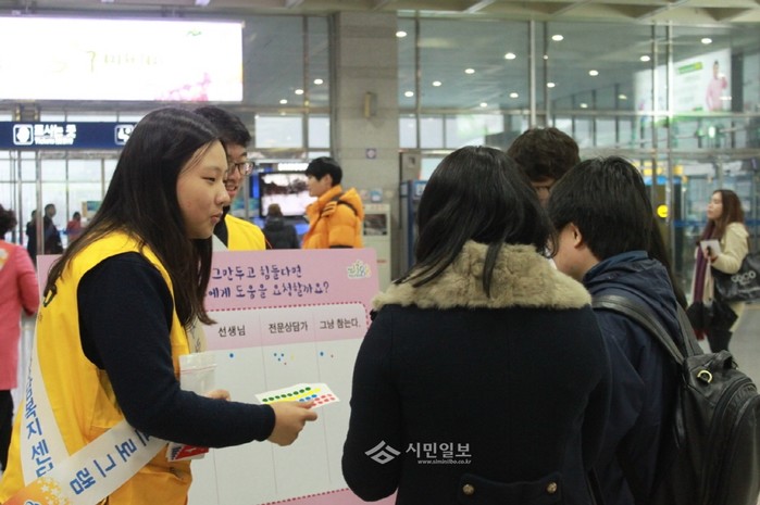 [시민일보]지난 26일 경북 구미시 청소년상담복지센터는 구미역 일대에서 학업중단 청소년들에게 전문적인 상담·체험·학업 지원 프로그램을 실시하는 '학업중단 청소년 통합지원프로그램(두드림ㆍ해밀)'의 거리홍보활동을 펼쳤다. 사진은 홍보 중인 청소년참여위원들의 모습.