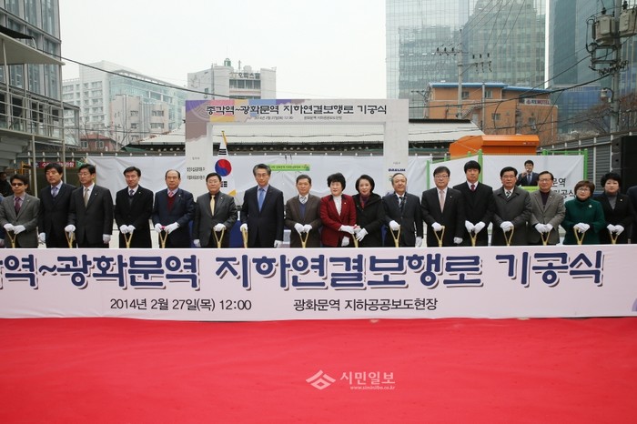서울 종로구는 지난 27일 2015년 완공을 목표로한 ‘각역~광화문역 지하연결보행로 기공식’을 가지고 공사에 들어갔다. 종각역에서 종로구청과 광화문역까지 연결되는 지하보도를 만드는 것으로 지상으로 나오지 않아도 자유롭게 이동할 수 있게 된다. 사진은 기공식에 참석한 김복동 의장, 김영종 종로구청장, 구의원들의 모습.