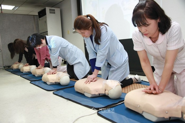 [시민일보]서울 구로소방서는 지난 27일 금천구 서울예수요양병원 6층 교육장에서 간호사 및 요양보호사 등 관계자를 대상으로 심폐소생술 등 응급처치교육을 실시했다. 사진은 서울예수요양병원 관계자들이 심폐소생술을 실습하는 모습.