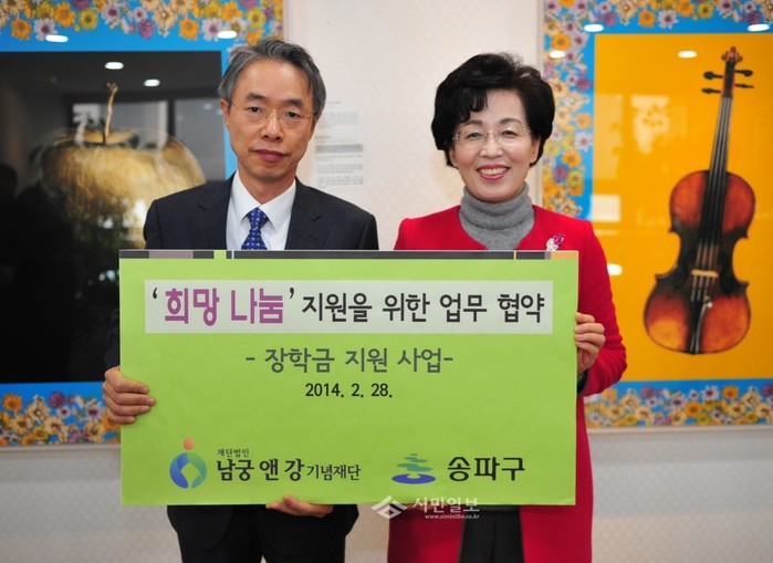 [시민일보]서울 송파구는 지난 28일 (재)남궁앤강과 구의 미래 인재 발굴·육성을 위한 학생 장학금을 지원하는 ‘희망’사업과, 보건의료 수혜 사각지대에 놓인 저소득층을 위한 의료비를 지원하는 ‘나눔’사업을 위한 업무 협약을 체결하고 주민들의 교육 및 보건의료 부문에 대해 집중적인 지원에 나선다. 사진은 협약식 모습.