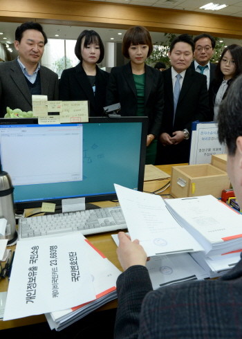원희룡 전 새누리당 의원과 초임 변호사들이 28일 오전 서울 서초동 중앙지법 민원실에 카드사들을 상대로 개인정보 유출사고 2차 손해배상 청구소송을 접수하고 있다. 이날 원 전 의원과 사법연수원을 수료한 43기 출신 변호사들은 개인정보 유출 피해자 5만5천여 명을 대리해 KB국민카드와 롯데·농협카드 등을 상대로 모두 551억여 원을 청구하는 소장을 서울중앙지방법원에 제출했다.