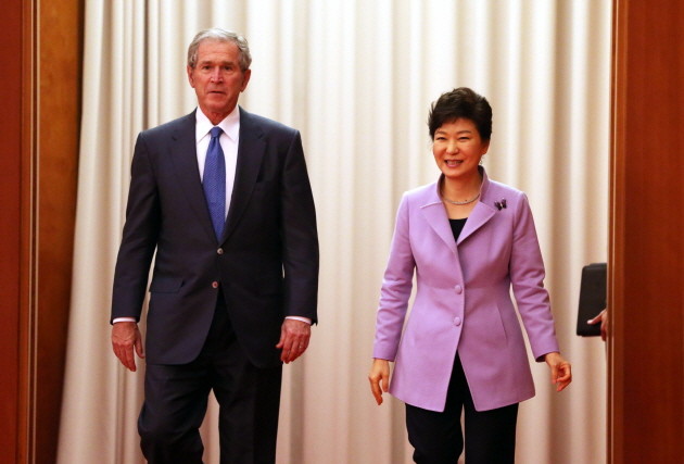 박근혜 대통령이 3일 오전 청와대에서 조지 워커 부시 전 미국 대통령과 만나 접견장으로 이동하고 있다.